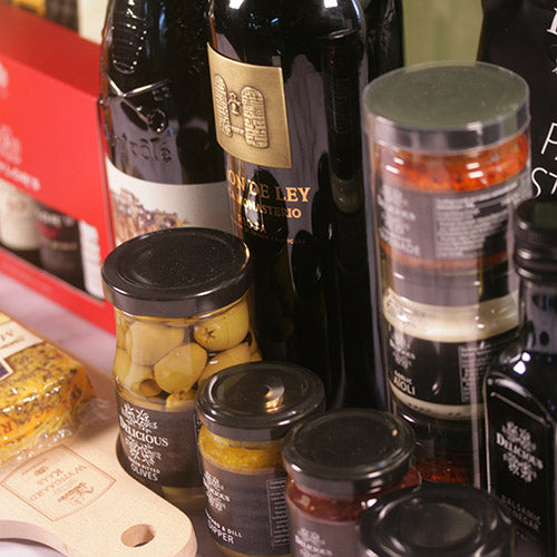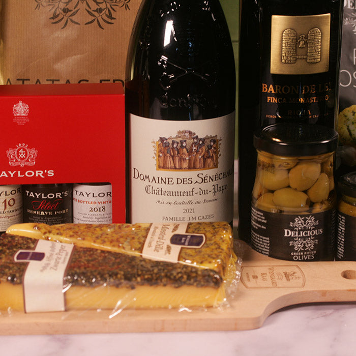 A lavish gift featuring two powerful red wines: the Châteauneuf-du-Pape Domaine des Senechaux and the Baron de Ley Finca Monasterio from Rioja. It also includes a Taylor's Mini Port set and a wide selection of delicacies such as Ibérico ham, Wyngaard Duo Cheese, olives, crackers, and various dips. A complete and stylish gift box that invites you to enjoy.
