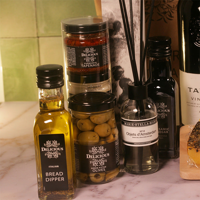 An impressive gift featuring three premium wines: the refined Meursault Cru Les Charmes , the powerful Amarone Campo Dei Gigli , and the exclusive Taylor's Vintage Port 2007. It also includes a generous selection of delicacies such as Ibérico ham, Wyngaard Duo cheese, olives, crackers, dips, and tapenades. The package is completed with luxurious fragrances from Marie-Stella-Maris Objets d'Amsterdam and 500 grams of artisanal chocolates. A truly exquisite gift box, perfect for a special occasion.