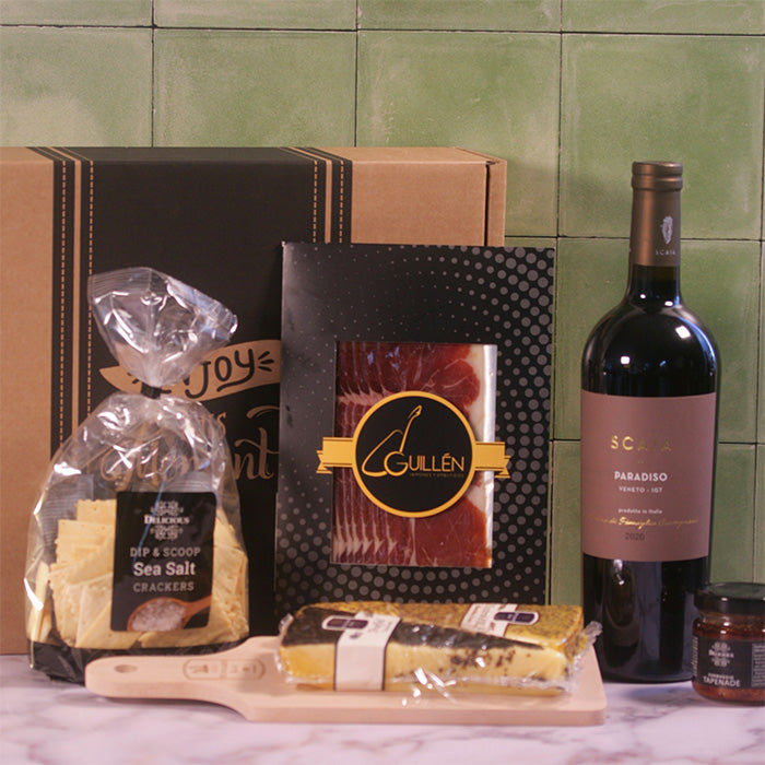 Dieses wunderbar zusammengestellte Paket ist perfekt für ein entspanntes und genussvolles Beisammensein. Der weiche und dennoch charaktervolle Rotwein Scaia Paradiso harmoniert hervorragend mit einer Auswahl an edlen Käsesorten und feinen Wurstwaren.