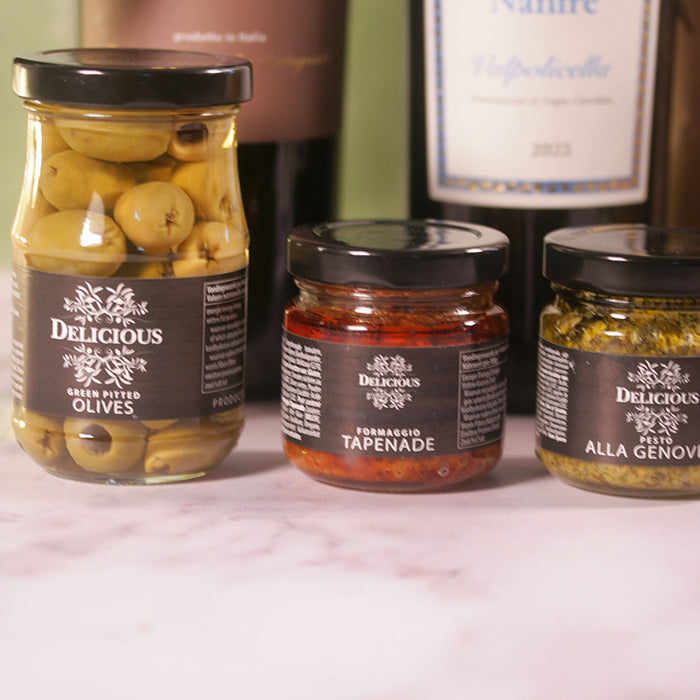 Diese Geschenkbox vereint zwei unverwechselbare italienische Weine mit einer Auswahl herzhafter Köstlichkeiten und einem Hauch von Luxus. Der Valpolicella Nanfrè und der Scaia Paradiso bilden ein wunderbares Weinduo für jede Zusammenkunft. Dazu gibt es knusprige Patatas Fritas , grüne Oliven , Pesto alla Genovese , eine herzhafte Formaggio-Tapenade und Meersalz-Cracker . Als Bonus enthält dieses Paket Marie-Stella-Maris Duftstäbchen . ein stilvolles Detail, das Atmosphäre ins Zuhause bringt.