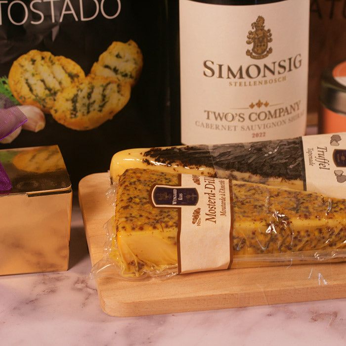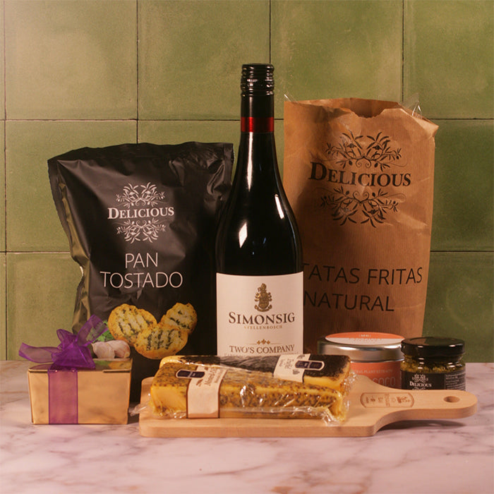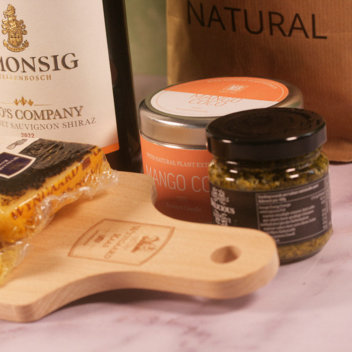Een toegankelijk en smaakvol geschenk met de Simonsig Cabernet Sauvignon Shiraz uit Zuid-Afrika. Daarbij ambachtelijke bonbons, Wyngaard Duo Kaas en een selectie hartige delicatessen zoals patatas fritas, pan tostado en pesto alla Genovese. De geurige Mango Coco kaars geeft dit geschenk een extra sfeervol accent.