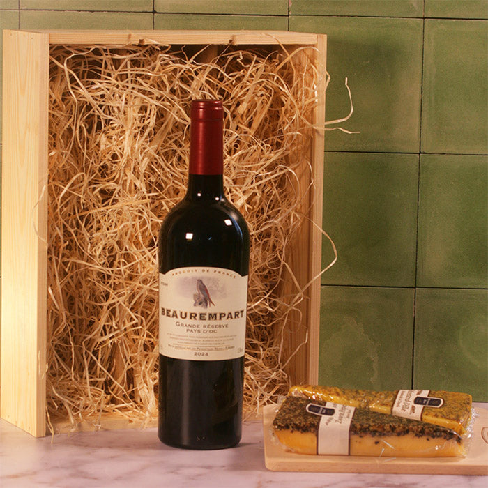 Verras een wijnliefhebber met dit verfijnde kaas- en wijncadeau in luxe verpakking. In dit stijlvolle geschenk vind je een karaktervolle fles Beaurempart Grande Réserve Rouge, gecombineerd met een ambachtelijk Wyngaard kaasduo op een houten serveerplankje – prachtig gepresenteerd in een houten kistje.