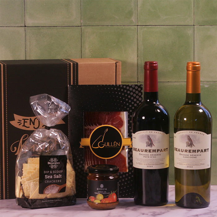In het pakket twee heerlijke wijnen van Beaurempart. Een witte en rode wijn. Dit zijn allemans vrienden en worden zeer gewaardeerd door onze klanten.  Verder in het pakket een heerlijk Iberico Bellota ham (100 gram), tomaten-olijvenspread (180 gram) en om de borrel af te maken zeezout crackers.