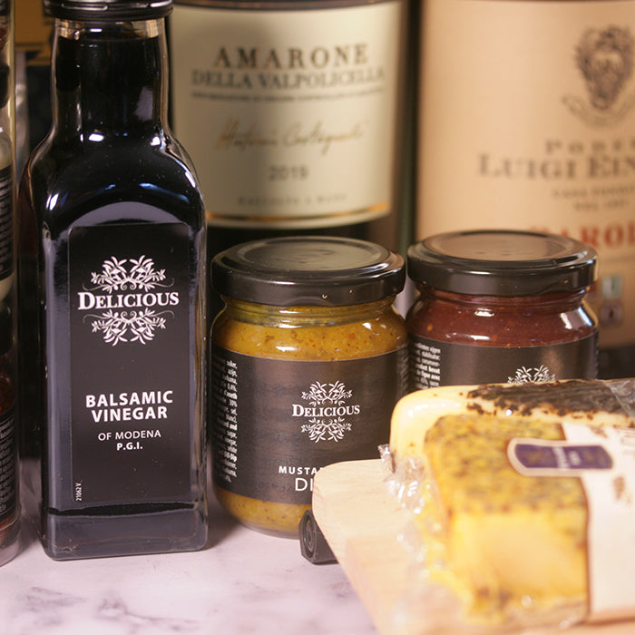 An exclusive gift featuring two top Italian wines: the powerful Amarone della Valpolicella and the elegant Barolo Luigi Einaudi . Along with a selection of fine delicacies such as Ibérico ham, Wyngaard Duo cheese, olives, crackers, and various dips, this luxurious gift box is presented. The addition of a scented Marie-Stella-Maris candle completes this stylish package.